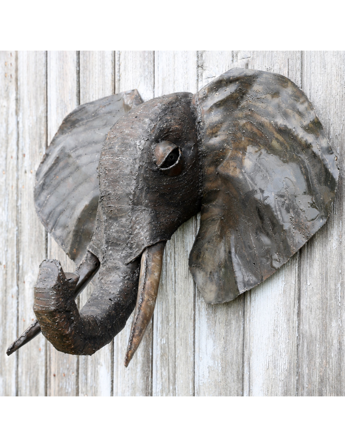 Masque trophée d'éléphant en métal recyclé, entièrement réalisé en artisanat fait main par des artisans du Zimbabwe. Chaque pièce est unique, façonnée à partir de matériaux récupérés puis travaillée avec soin, ce qui lui confère un caractère authentique et une véritable histoire.
