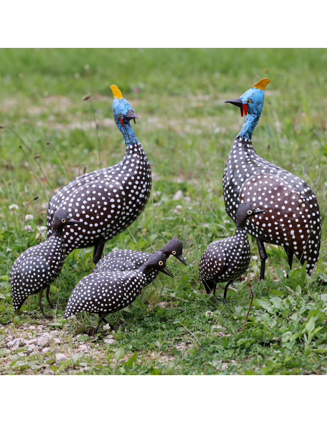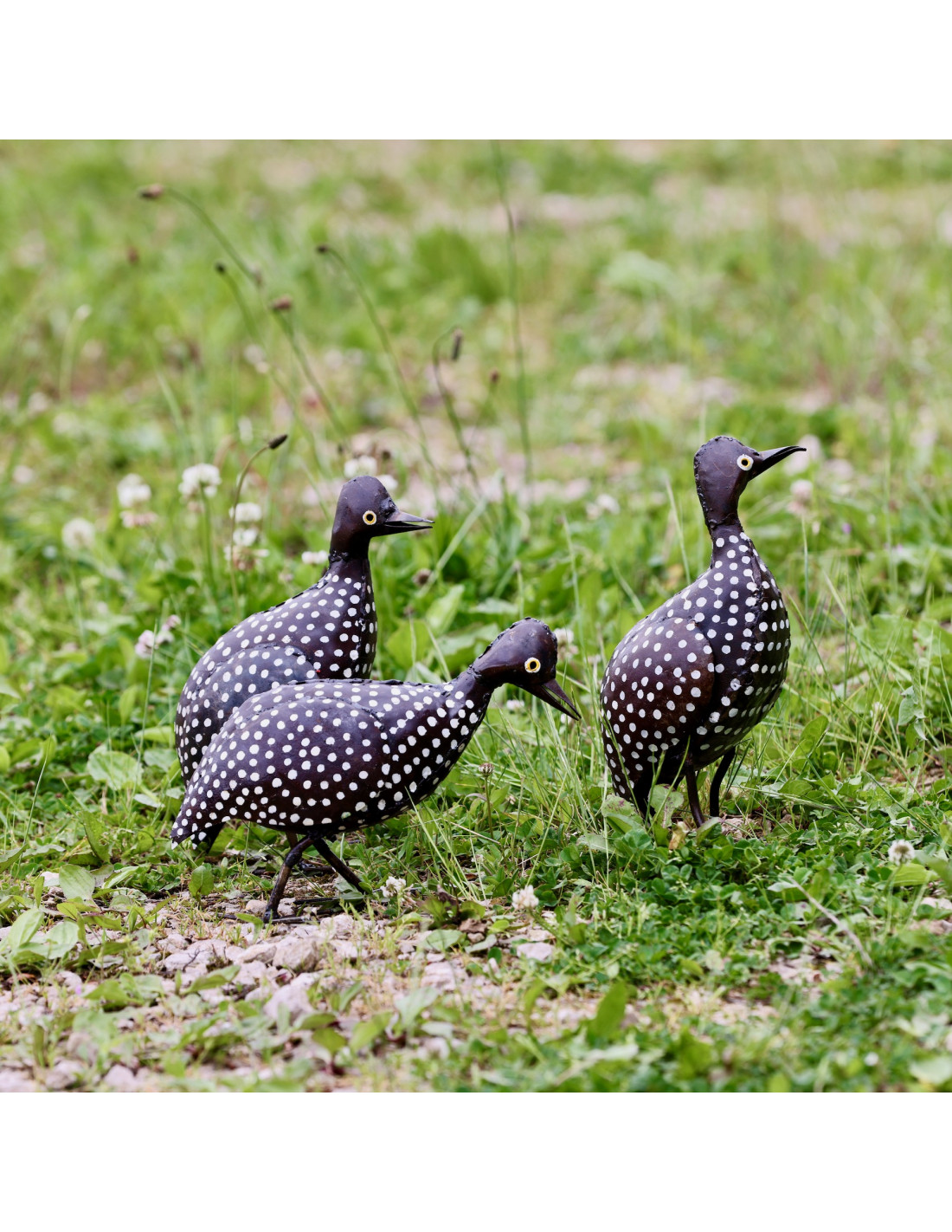 Fabriquée à partir de métal recyclé, chaque pièce est façonnée, soudée puis peinte à la main. Chaque pintade est donc unique : attitudes et expressions peuvent varier, donnant à chaque création son propre caractère.
