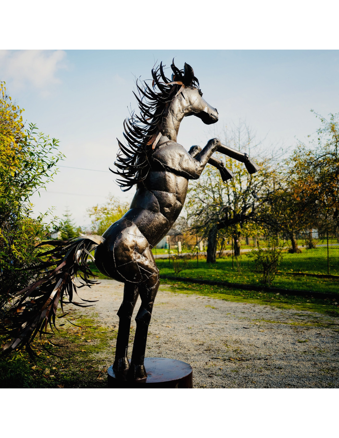 Apportez du caractère à votre espace avec cette impressionnante sculpture représentant un cheval cabré, réalisée en métal recyclé.
