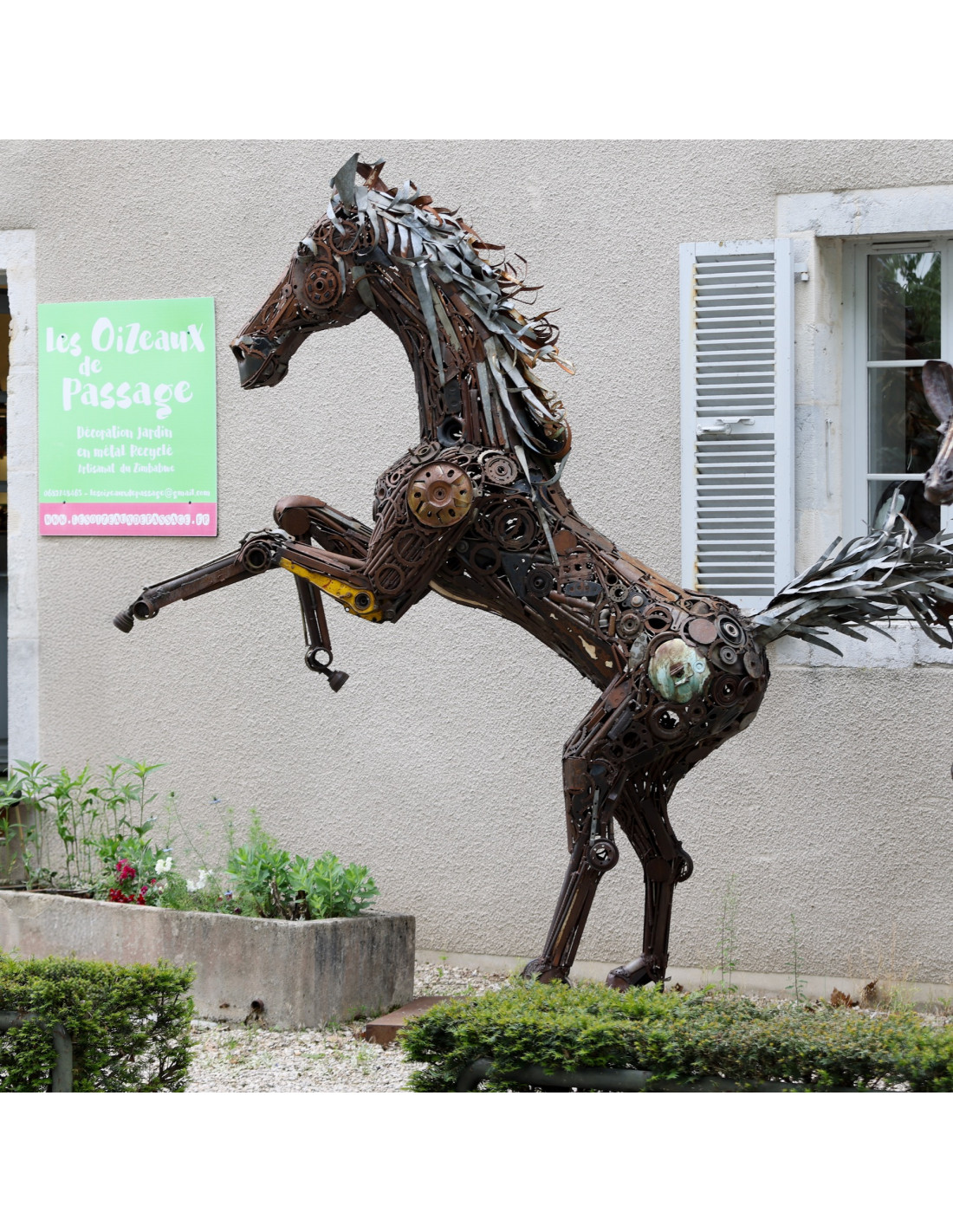Cette sculpture impressionnante de cheval cabré est réalisée à partir de métal recyclé, soigneusement assemblé à la main. Son allure à la fois puissante et élégante lui confère une présence remarquable, idéale pour mettre en valeur un jardin, un parc ou tout espace extérieur à la recherche d’une touche originale.
